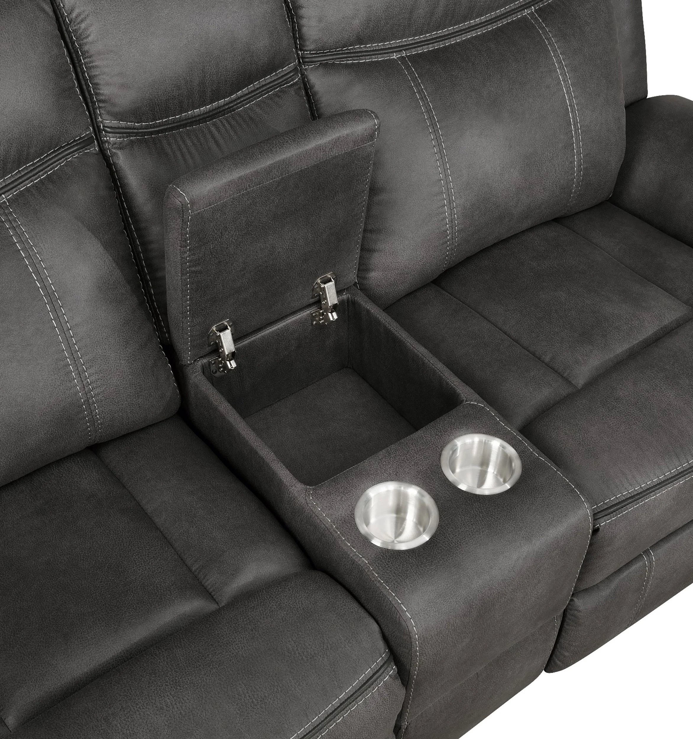This reclining loveseat combines cozy comfort with practical convenience. Upholstered in performance-grade microfiber, it features padded arms, a tufted back, and pocket coil cushions with cool gel memory foam for supportive, temperature-regulated seating. Manual recline mechanisms on both sides allow effortless relaxation, while a center console adds functionality with lift-top storage and dual stainless steel cup holders. With a wall-hugger design that maximizes floor space, this loveseat is both stylish and functional for the living room. Key Features: • Reclining loveseat in charcoal microfiber with padded arms and tufted back • Manual reclining seats allow smooth operation and effortless relaxation • Wall-hugger mechanism keeps loveseat close to wall while maximizing space • Pocket coil cushions with cool gel memory foam enhance seating comfort • Center console with lift-top storage and dual stainless steel cup holders • Performance-grade microfiber upholstery ensures softness and durability