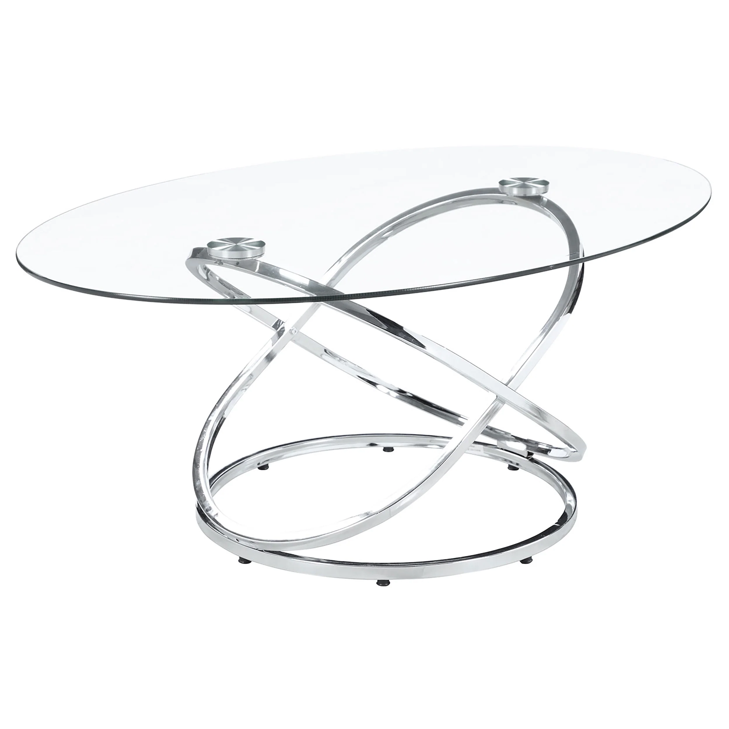 This striking coffee table set includes a cocktail table and two matching side tables, perfect for modern living spaces. Featuring clear tempered glass tops, these tables exude elegance and durability. The bases showcase polished chrome-finished metal in an intertwined ring design, adding a touch of contemporary flair. The open framework enhances visual lightness, making the set ideal for smaller spaces. Designed for style and functionality, this set is a versatile addition to any room. Key Features: • Modern coffee table set includes a cocktail table and two stylish matching side tables • Clear tempered glass tops combine elegance with enhanced strength and lasting durability • Intricate intertwined ring bases create an open and visually airy modern design • Polished electroplated chrome finish adds a sleek and sophisticated appeal • Heavy gauge metal construction ensures stability and reliable everyday use • Versatile design enhances style and functionality for contemporary living spaces