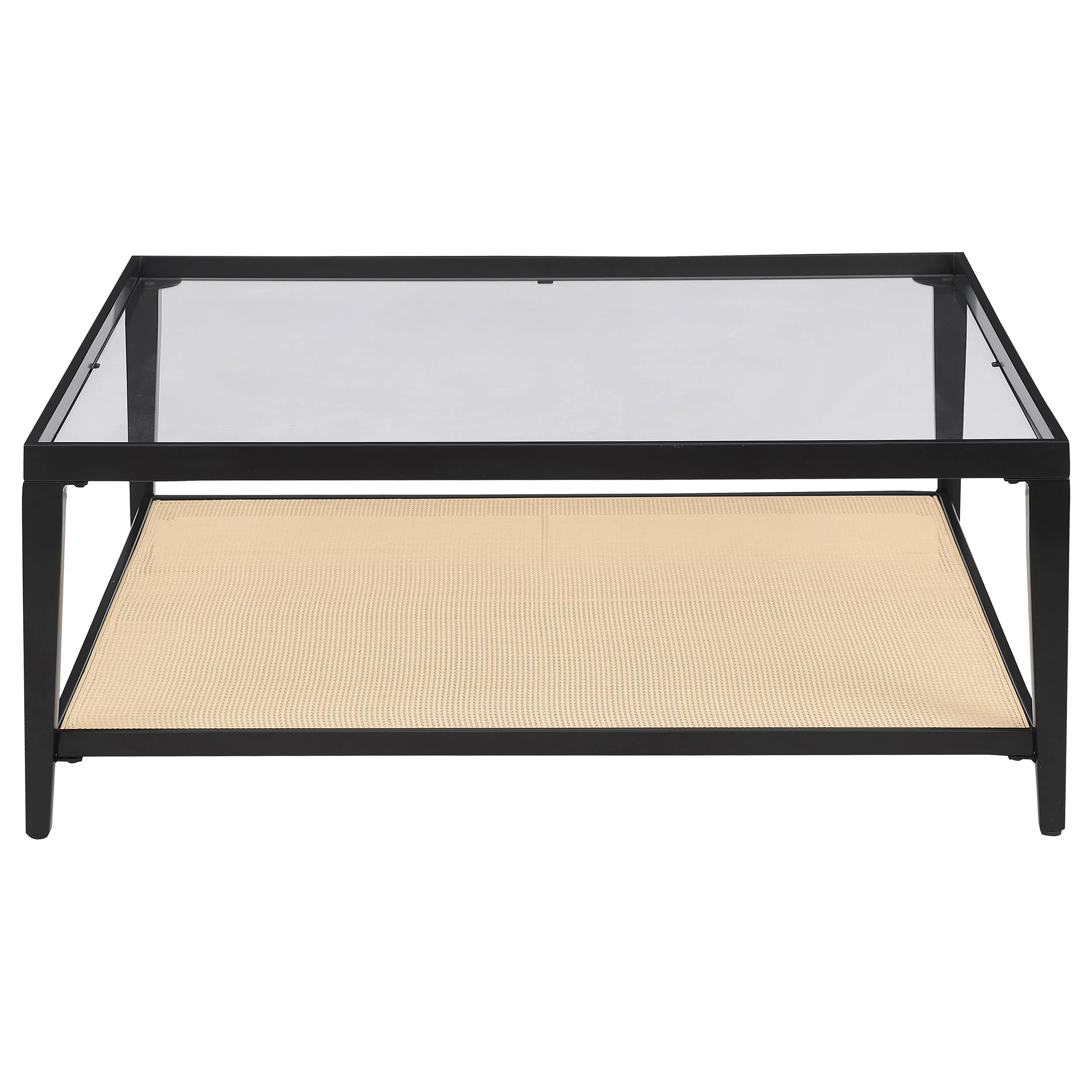 Enhance your living room with the contemporary charm of this sleek square coffee table. The black powder-coated metal frame creates a clean, modern aesthetic, while the recessed clear tempered glass top provides an elegant and spacious surface for your decor or coffee essentials. Below, a shelf crafted from radio weave polyethylene (PE) rattan adds a unique texture and convenient storage, blending natural materials with modern design. This cocktail table brings a sophisticated, functional touch to any seating area, making it the perfect centerpiece for a stylish living room. Its versatile design complements various décor styles, elevating your space with ease. Key Features: • Square coffee table featuring a sturdy black powder-coated metal frame for lasting durability • Clear tempered glass top provides a sleek, elegant surface that is easy to clean and maintain • Woven polyethylene (PE) rattan shelf adds unique texture and practical storage options • Blends natural materials with contemporary design for a stylish, functional accent piece • Generous top offers ample space for decor, coffee essentials, or everyday items • Versatile design works seamlessly with modern or transitional living room aesthetics
