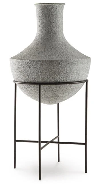 Take an effortlessly inviting approach to floor decor. This vase's distressed, textured look in a neutral hue pairs with a variety of casual color palettes. An espresso brown stand adds charming contrast to the look. And this vase enthusiastically welcomes faux florals and filler, perfectly adapting to the seasons when you swap out your arrangements.